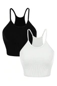 Ana Sayfa Giyim & Aksesuar Kadın Giyim Bluz 2 Li Paket Yüzücü Sırtlı Siyah Beyaz Renk Desensiz Fitilli Kolsuz Askılı Likralı Fit Spor Büstiyer