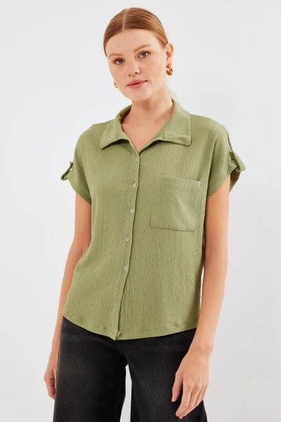 20256 Manşetli Double Kısa Kollu Gömlek - Çağla