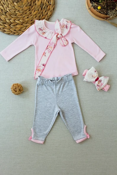 3-6 6-9 9-12 Ay Matmazel Yaka Fırfır Detaylı Bandanalı Uzun Kollu Sweat 3lü Kız Bebek Takımı Pembe