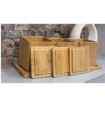 3'lü Kapaklı Bambu Saklama Kabı Seti | Doğal Ahşap Standlı