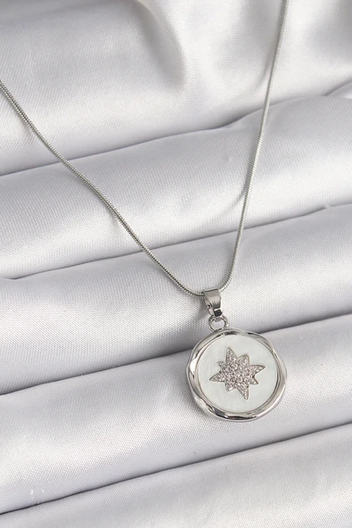 316L Çelik Gümüş Renk Zincir Beyaz Sedefli Zirkon Taşlı Yıldız İşleme Model Kadın Kolye - TJ-BKO9635