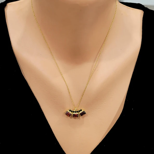 925 Ayar Gümüş 3 Taşlı Kolye, Pembe - Turuncu, Siyah Taş