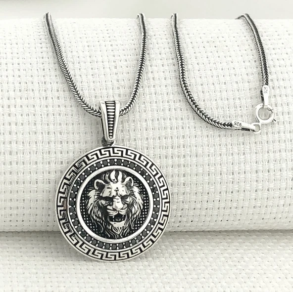 925 Ayar Siyah Taşlı Aslan Figürlü Gümüş Kolye