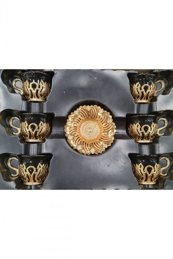 Ahsen Lale Nokta Desen Siyah Gold Altın 6 Kişilik Türk Kahvesi Fincan Seti
