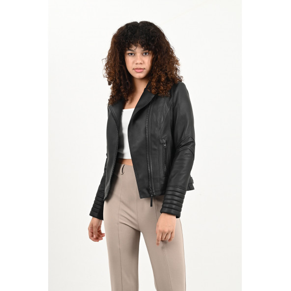 Alexa Siyah Biker Hakiki Deri Ceket Kadın