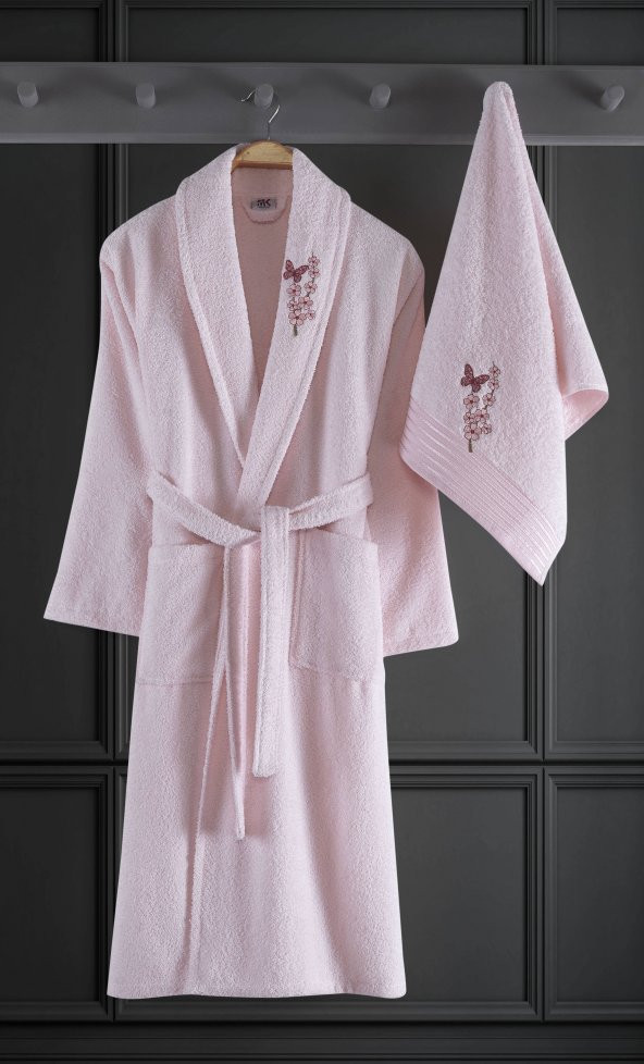 Alya Nakışlı Pamuklu 2 Parça Bornoz Seti Pembe
