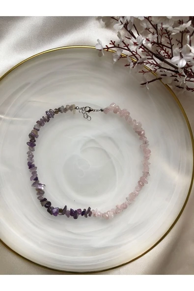 Ametist Ve Pembe Kuvars Doğal Taş Kolye