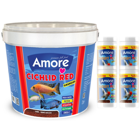 Amore Cichlid Red Granules Kova 3 Kg Akvaryum Balık Yemi Ve 4x125ml Gold Mix Japon Balığı Yemi