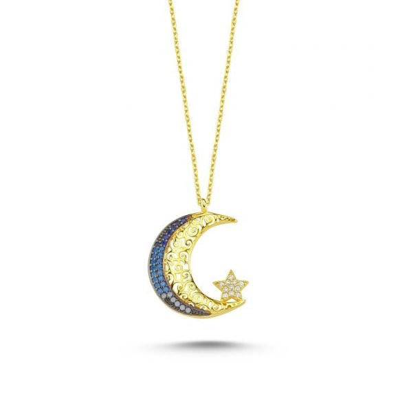 Angemiel 925 Gümüş Ajur Desenli Ve Mavi Tonlamalı Nano Taşlı Ay Yıldız Kolye
