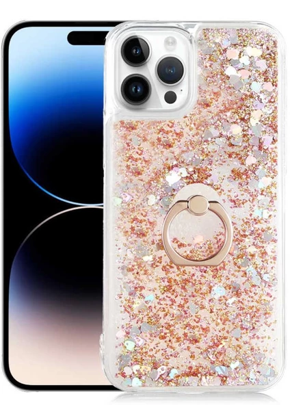 Apple iPhone 14 Pro Max Kılıf Sıvılı Simli Pullu Yüzüklü Standlı Lüx Silikon