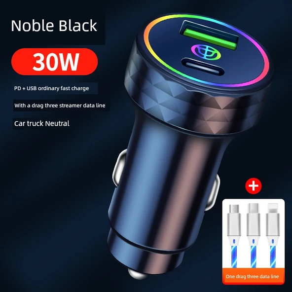Araç Şarj Cihazı - Siyah 30W 3'ü 1 Arada Kablolu