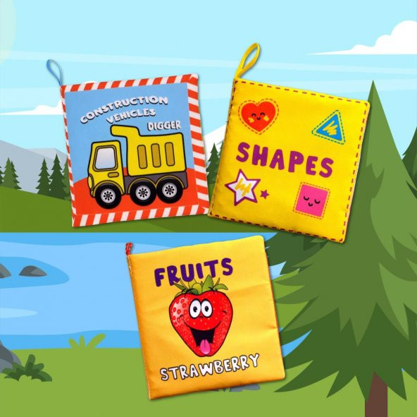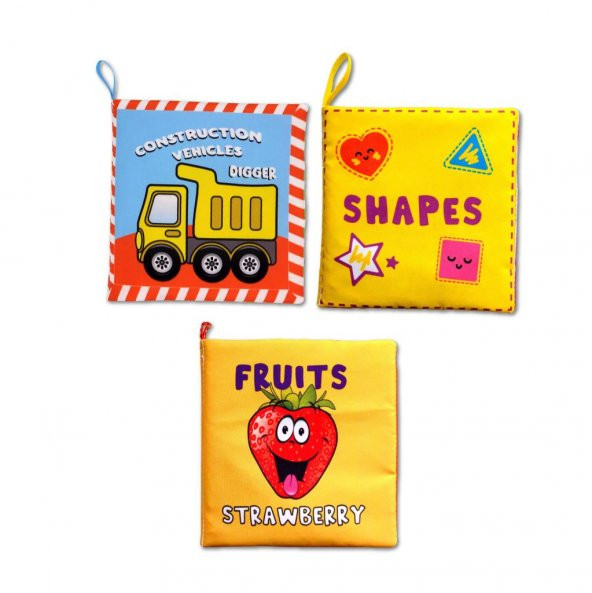 3 Kitapİngilizce İş Makinaları , Şekiller ve Meyveler Kumaş Sessiz Kitap E118 E126 E131 - Bez Kitap