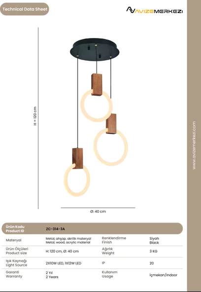 3'lü Yuvarlak Sarkıt MEŞE ZC-314-3A