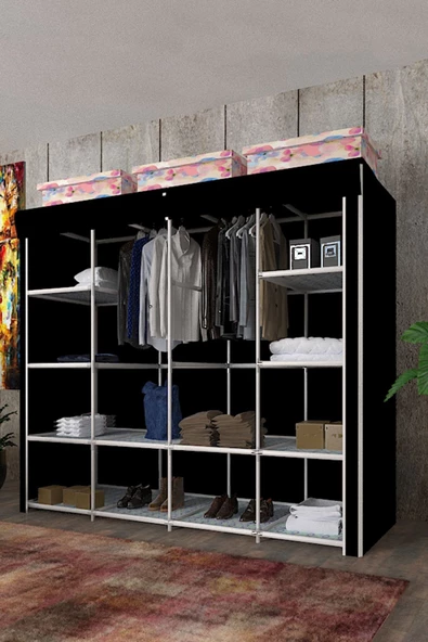 Burak Çelik Borulu Plastik Raflı Siyah Bez Dolap Gardırop
