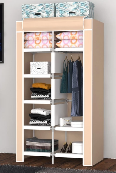 Burak Çelik Borulu Plastik Raflı Bej Bez Dolap Gardırop
