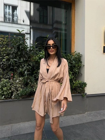 JAKARLI KİMONO - ŞORT TAKIM - Bej