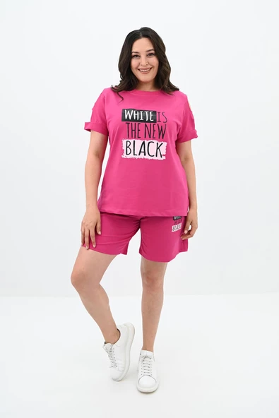 Kadın Açık Omuz Detaylı Yazı Baskılı Büyük Beden Şortlu Takım 3802-23