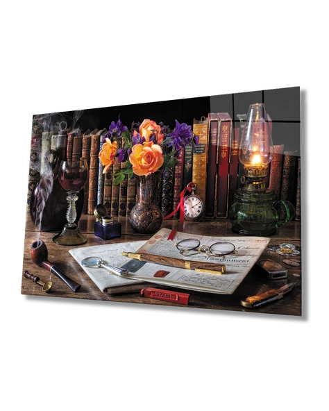 Saat Kitap Çiçek Natürmort Dekoratif ve Modern Cam Tablo