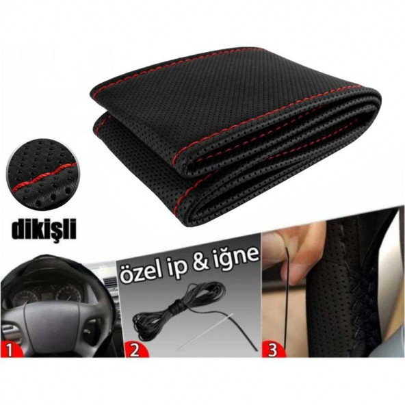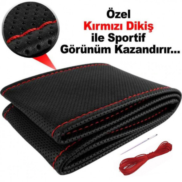 Dikmeli Deri Direksiyon Kılıfı Noktalı Delikli Kırmızı Ipli Standart 38cm