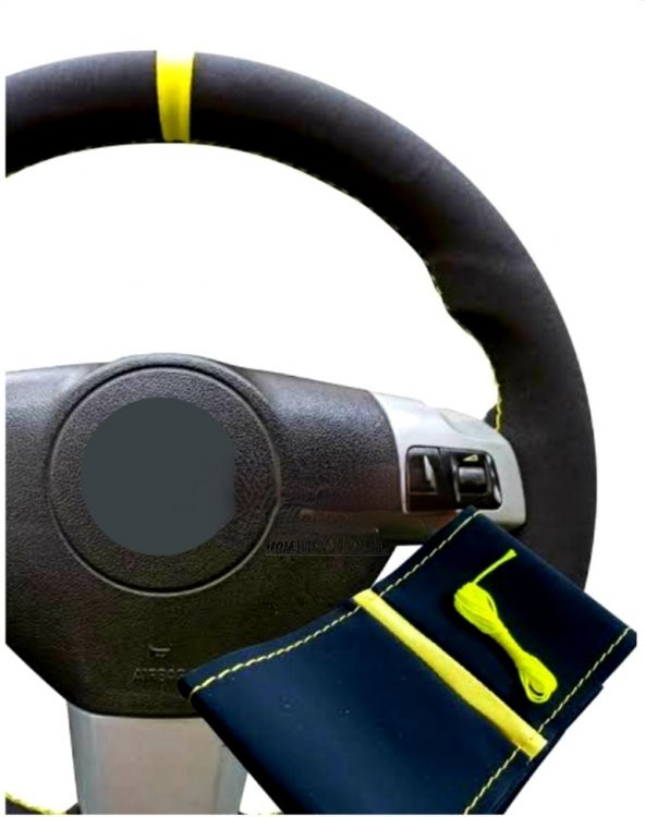 Universal Siyah Alkantara Dikmeli Direksiyon Kılıfı Sarı Ipli
