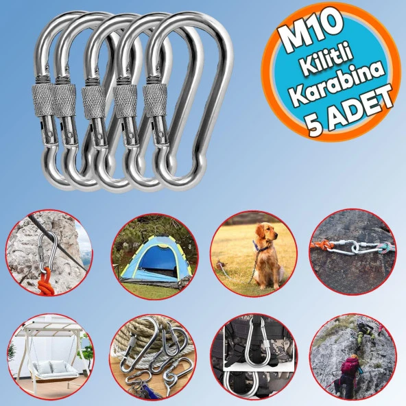 Karabina Yaylı Kanca Paslanmaz Çelik Kilit Olta Dağcılık Kamp Malzemeleri Salıncak (10 MM) 5 ADET