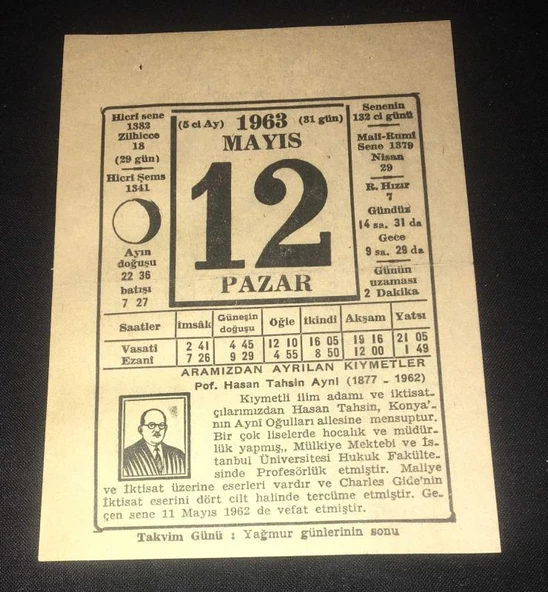 12 MAYIS 1963 PAZAR TAKVİM YAPRAĞI (Sahafiye Kitap)