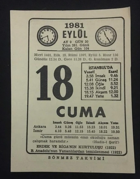 18 EYLÜL 1981 CUMA Sönmez Takvimi YAPRAĞI (Sahafiye Kitap)