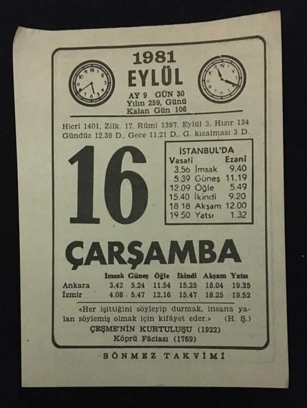 16 EYLÜL 1981 ÇARŞAMBA Sönmez Takvimi YAPRAĞI (Sahafiye Kitap)