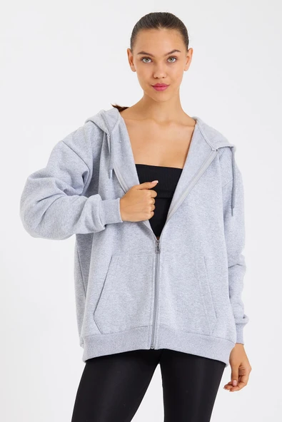 Kadın Kanguru Cepli Kapüşonlu Fermuarlı İçi Polarlı Hırka