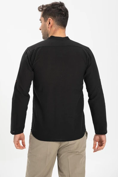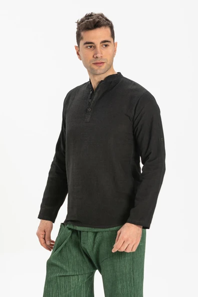 Uzun Kol Şantuklu Pamuk Bodrum Erkek Yazlık Tshirt Siyah 9003 S Siyah