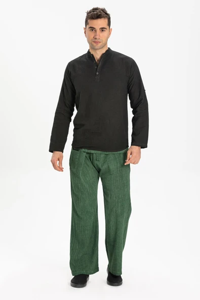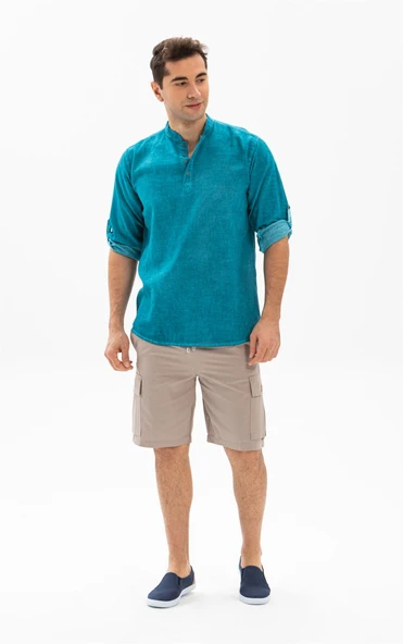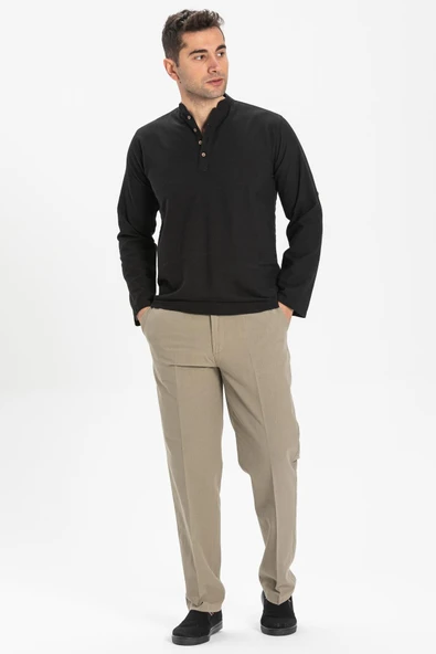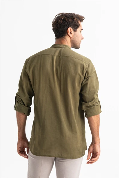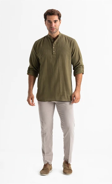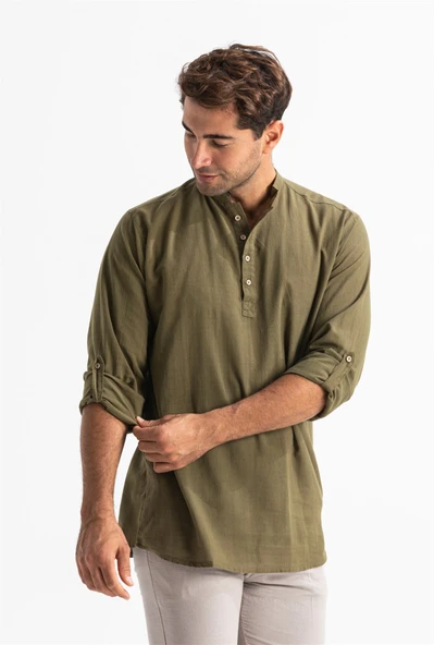 Uzun Kol Şile Bezi Tek Cepli Hakim Yaka Erkek Yazlık Tshirt Haki 3049 S Haki