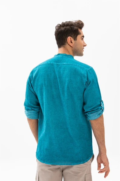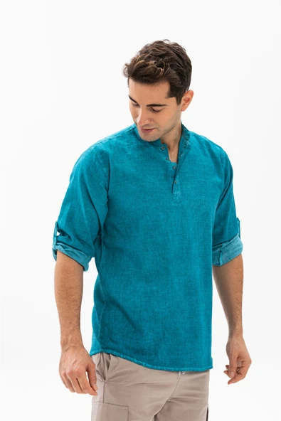 Uzun Kol Şantuklu Pamuk Bodrum Erkek Yazlık Tshirt Turkuaz 9013 S Turkuaz