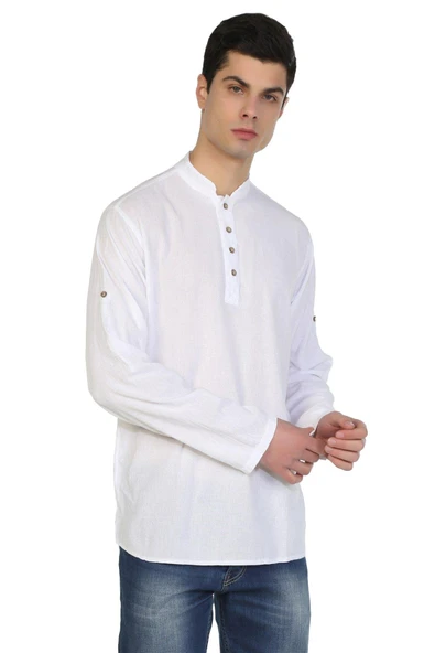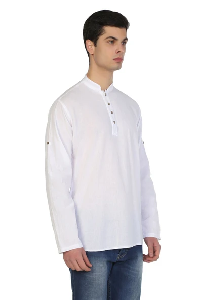 Uzun Kol Şantuklu Pamuk Bodrum Erkek Yazlık Tshirt Beyaz 9001 S Beyaz
