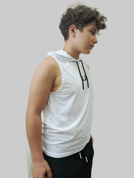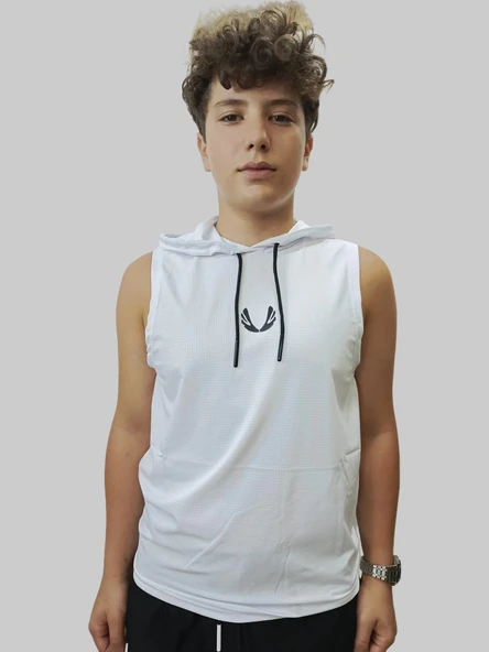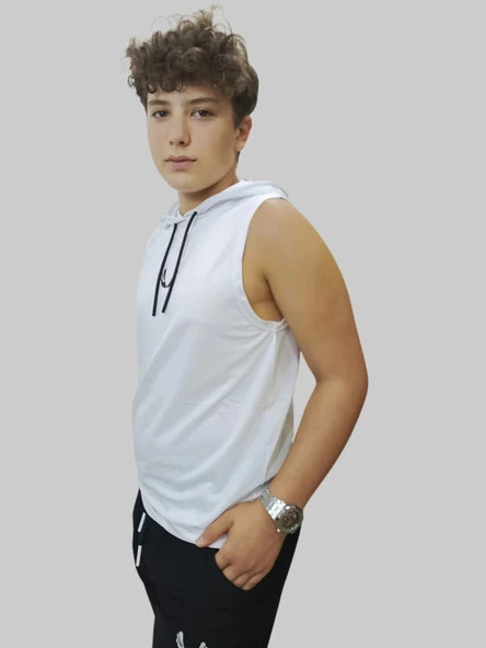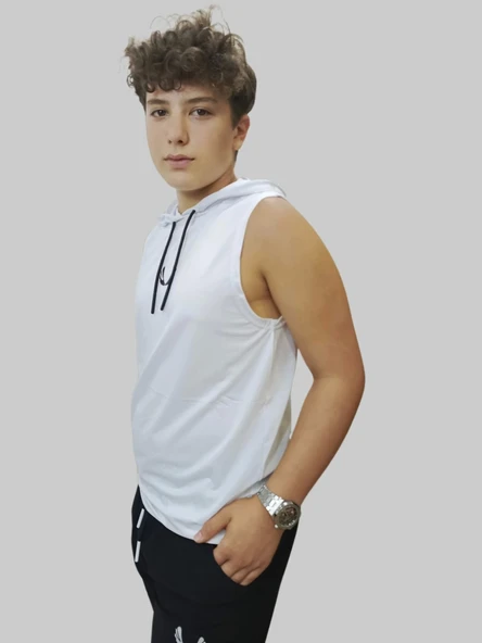 Erkek Lette Kapüşonlu Armalı Esnek Kolsuz Beyaz T-Shirt