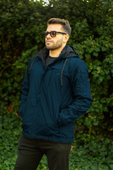 Erkek Lacivert Suya Dayanıklı Rüzgar Geçirmez Çıkarılabilir Kapüşonlu Balıkçı Motorcu Mont 23EMNTR860