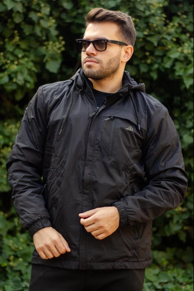 Erkek Siyah Suya Dayanıklı Rüzgar Geçirmez Çıkarılabilir Kapüşonlu Balıkçı Motorcu Mont 23EMNTR860