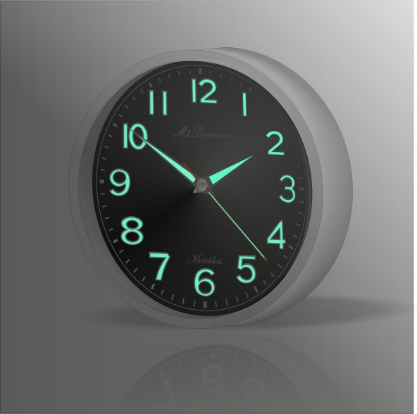 Beyaz Çerçeveli Siyah Zeminli Gece Görünen Işıldayan Fosforlu Sessz Duvar Saati
