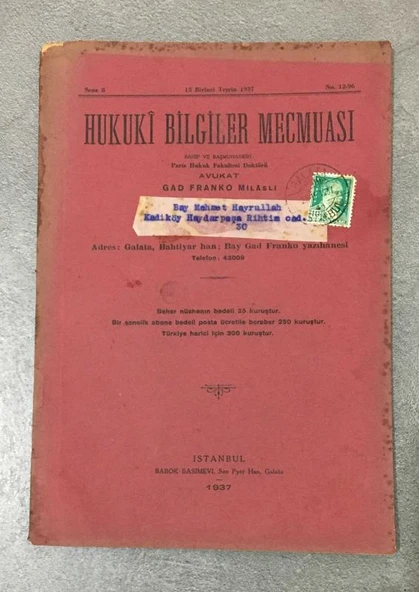HUKUKİ BİLGİLER MECMUASI 15 Birinci Teşrin 1937 Sene 8 No. 12 - 96 (Sahafiye Kitap)
