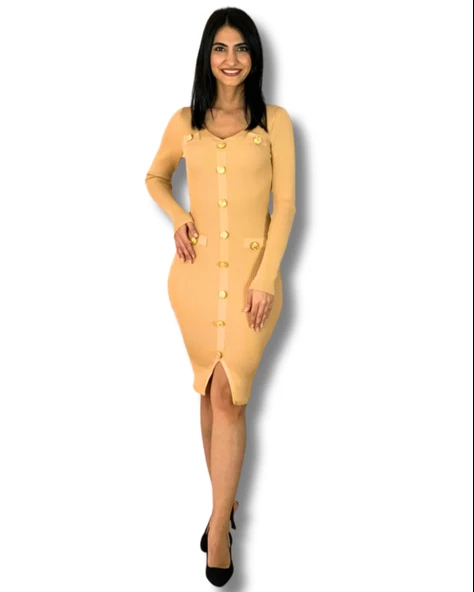 Kadın Uzun Kol Düğme Detaylı Fitted Ön Yırtmaçlı Triko Elbise (Bal)