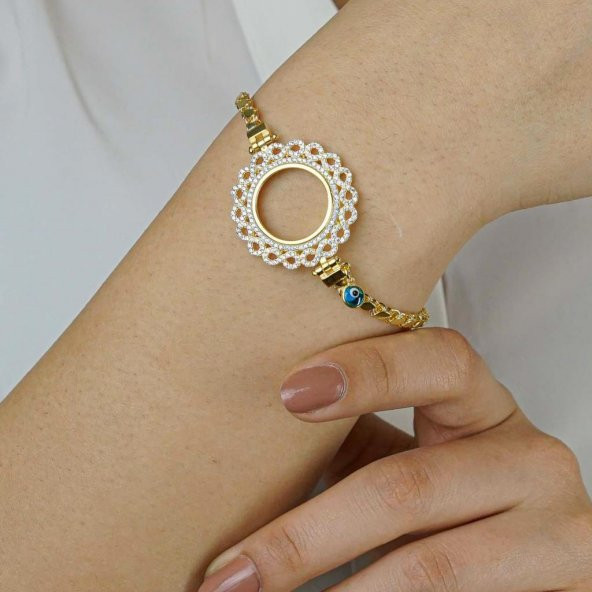 Sonsuzluk Tasarımlı Pullu Zincirli Nazarlı Altın Kaplama Çeyreklik 925 Gümüş Kadın Bileklik
