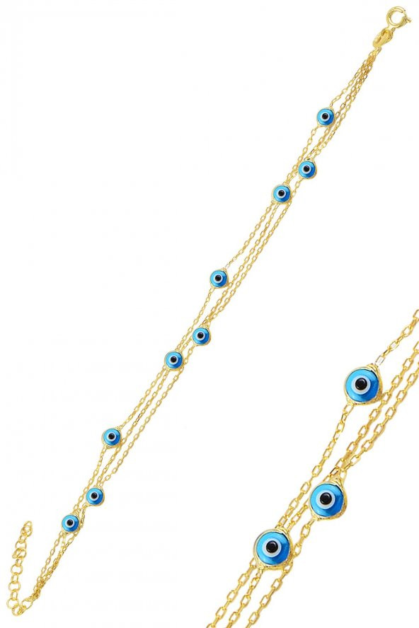 Gümüş altın yaldızlı, cam göz nazar üç zincirli gümüş bileklik