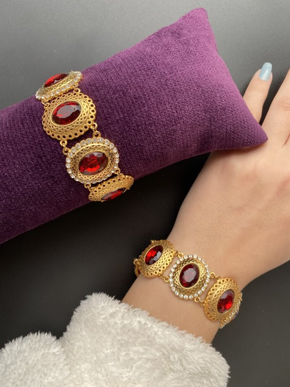 22 Ayar Altın Kaplama Kırmızı Taşlı Lüx Telkari Bileklik