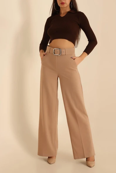 VioShine Kadın Kemerli Palazzo Yüksek Bel İspanyol Paça Pantolon