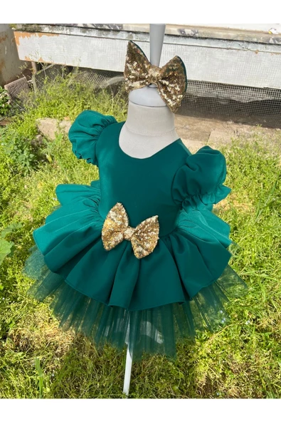 Kız Çocuk Yeşil Kabarık Abiye Elbise Gold Payet Detaylı