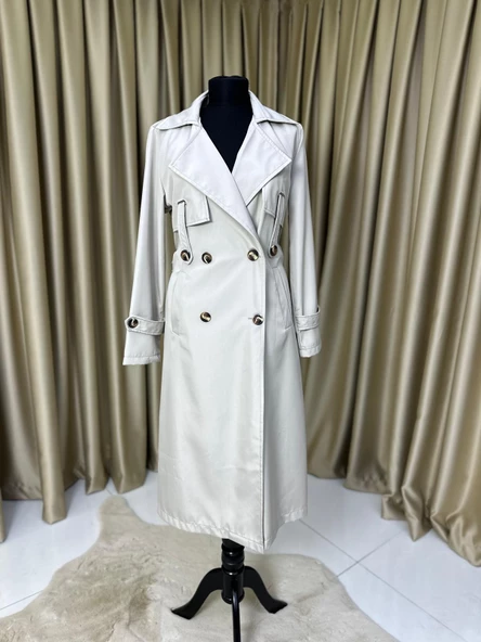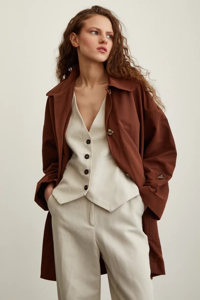İli İ01411 Kadın Keten Önü Düğmeli Trençkot