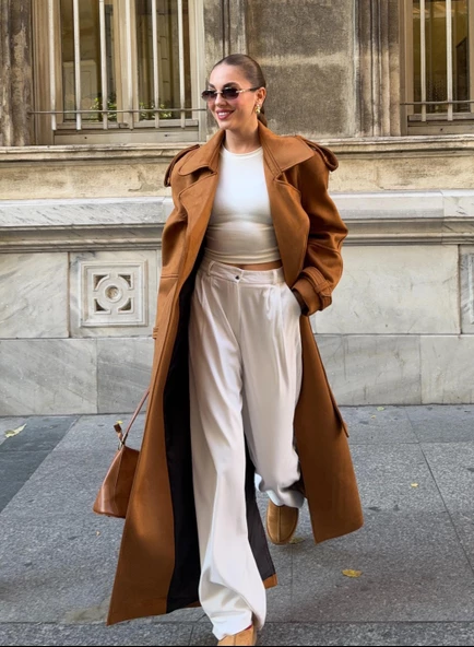 Çift Düğmeli Biye ve Kemerli Taba Kadın Trençkot