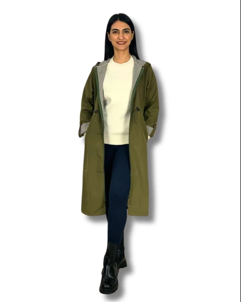 Kadın Kapüşonlu Çizgili Astarlı Haki Trençkot