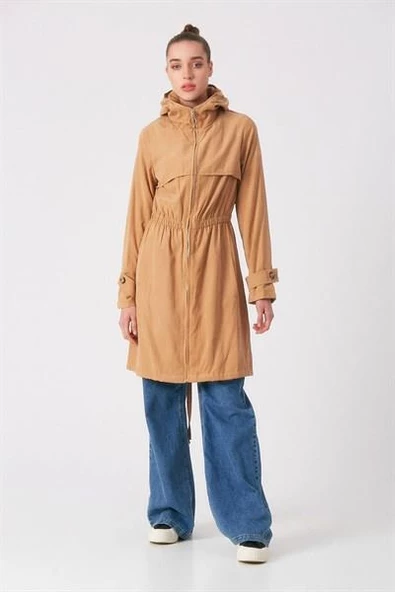Kadın Kapüşonlu Fermuarlı Trençkot Camel