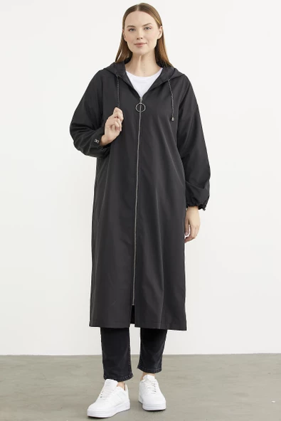 Büyük Beden Kapüşonlu Fermuarlı Uzun Trençkot - Siyah