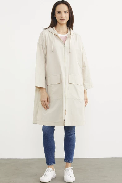 Büyük Beden Kapüşonlu Fermuarlı Uzun Trençkot - Vizon